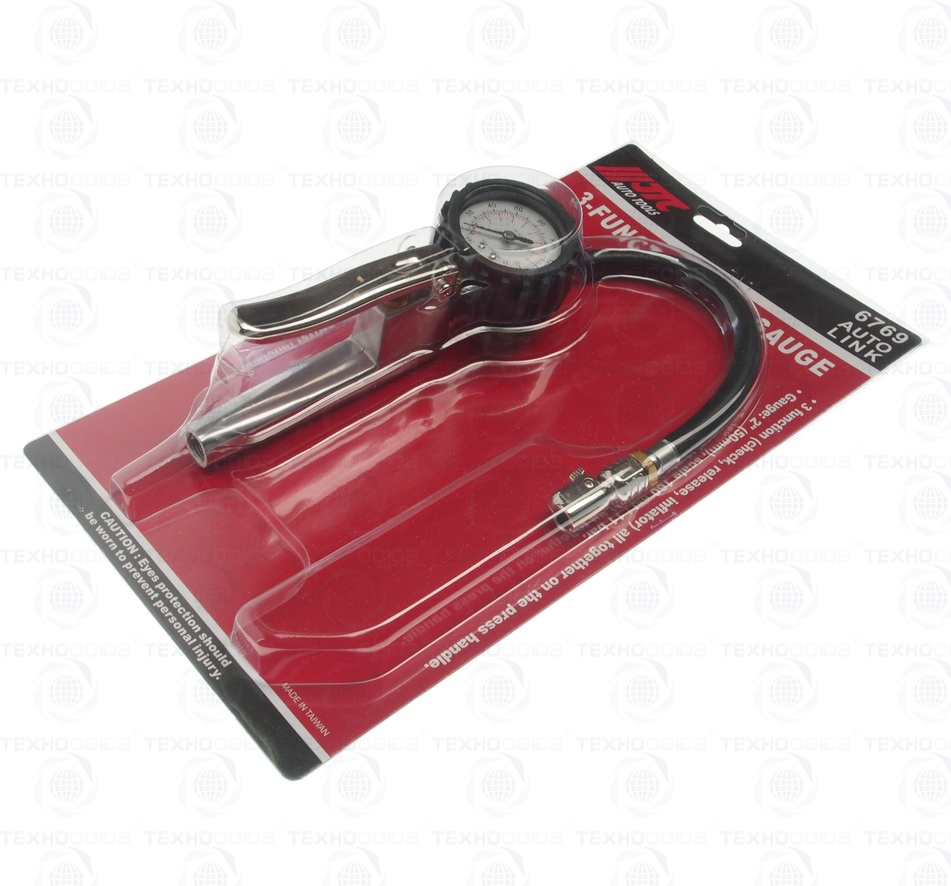 • JTC-6769 Манометр шинный с ручным клапаном, выполняет три функции: проверка давления, сбрасывает давление до нужного значения, накачивает до нужного значения.