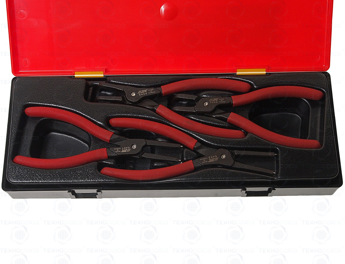 Набор съемников стопорных колец (клещи) (4 предмета) в прочном презентабельном боксе. Изготовлено из хром-ванадиевой стали, что обеспечивает высокую прочность и жесткость инструмента.