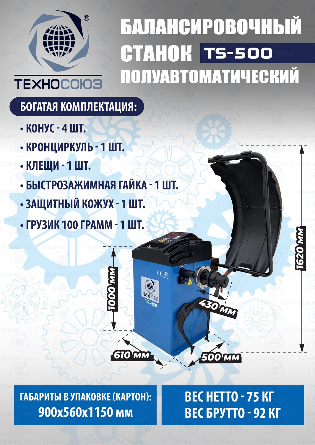 + TS-500 Балансировочный станок. Полуавтомат. Лазерная указка места установки грузика. Режимы работы: STANDART, STATIC, ALU1, ALU2, ALU3. Автокалибровка. Режим оптимизация дисбаланса. Режим MOTO. Автозапуск при опускании кожуха. Для легковых авто и «Газелей» с диаметром диска с резиной до 760 мм, диаметр диска 10–24” (256-610 мм). Гарантия 12 мес.Данные станки возим более 10 лет. Надежные - в сезон не подведут!