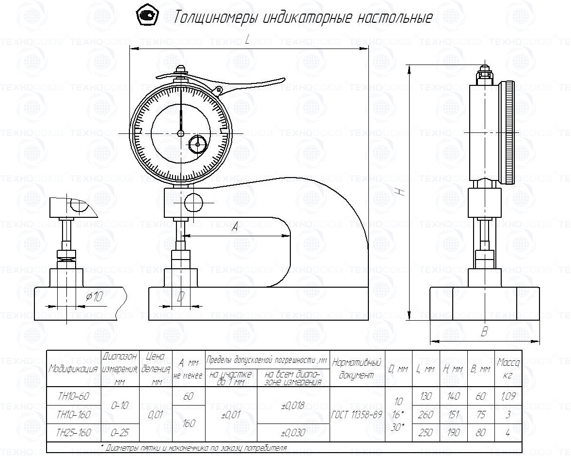 Пример условного обозначения настольного толщиномера с диапазоном измерения от 0 до 10 мм, с вылетом 60 мм, с нормированным измерительным усилием - Толщиномер ТН 10-60 ГОСТ 11358-89.