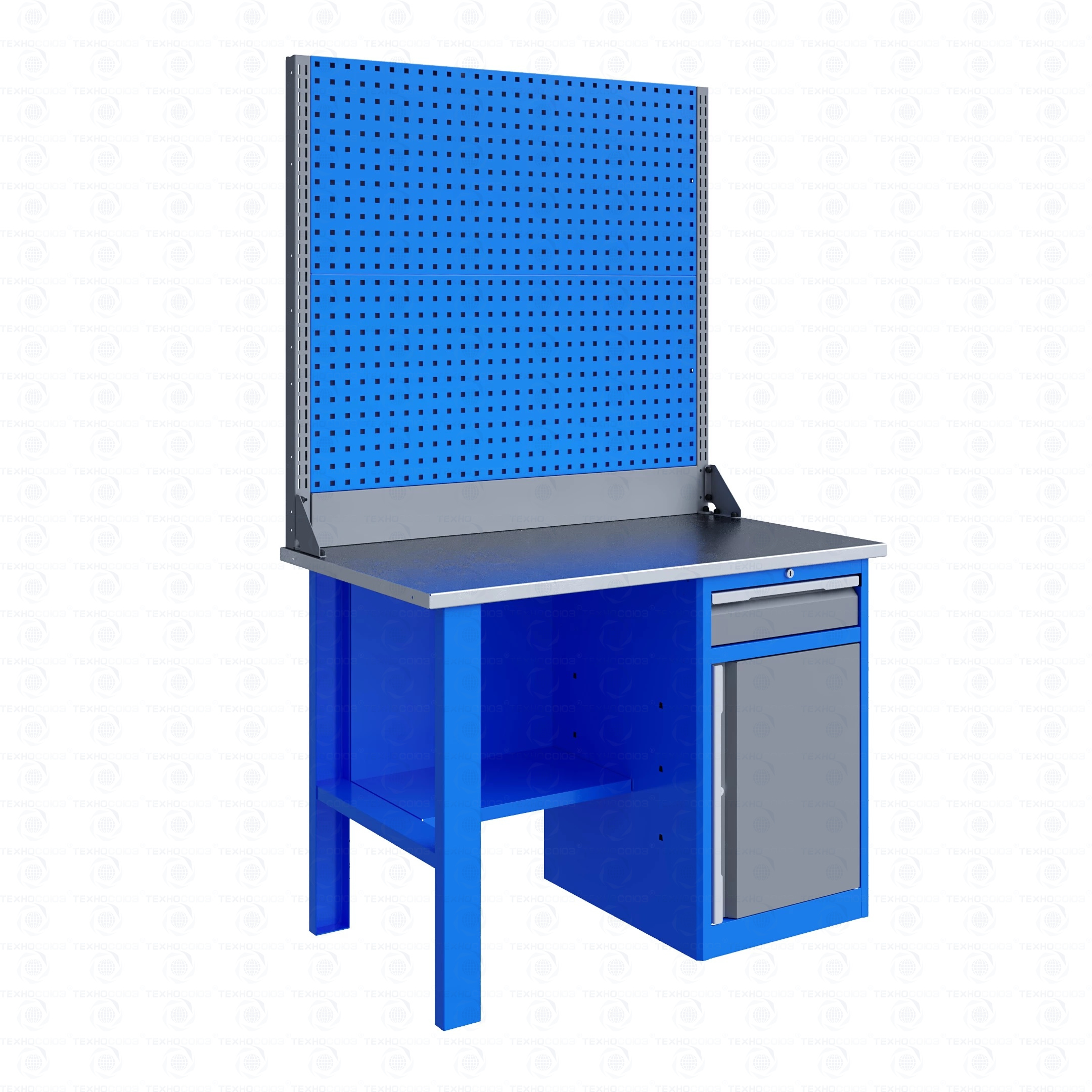 Однотумбовый. Допустимая нагрузка на столешницу 750 кг. Опорные элементы выполнены сварными из холоднокатаной стали. Верстак состоит из столешницы, опоры, тумбы P8 с малым ящиком и отделением с дверью и одной полкой, полки-стенки, двойного экрана с кронштейнами. Все металлические элементы покрыты полиэфирной порошковой краской. Столешница состоит из фанеры марки ФСФ толщиной 24 мм, которая покрыта лаком-антисептиком и листом оцинкованной холоднокатаной стали толщиной 1,2 мм. Размеры (ВхШхГ) 1965x1196x696 мм.