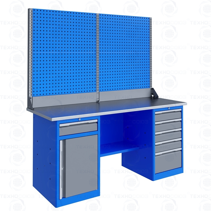 Тумбы верстаков выполнены сварными. Ящики в тумбах устанавливаются на шариковых телескопических направляющих полного выдвижения. В тумбе P5 установлено четыре малых и один большой ящик. Внутренние размеры малых ящиков (ВхШхГ), не более: 103 х 397 х 520 мм. Внутренние размеры больших ящиков (ВхШхГ), не более: 222 х 397 х 520 мм. Тумбы с ящиками снабжены общим центральным замком с поворотом ригеля 180 градусов и подпружиненной тягой. В тумбе P8 установлен малый ящик и имеется отделение с дверью и одной полкой. Ящик снабжен центральным замком с поворотом ригеля 180 градусов и подпружиненной тягой. Полка устанавливается на парах специальных формованных зацепов, выполненных в боковых стенках тумбы. Имеется возможность смены стороны открывания двери. Дверь тумбы снабжена центральным замком с поворотом ригеля 180 градусов. В комплекте имеется два ключа с каждым замком.